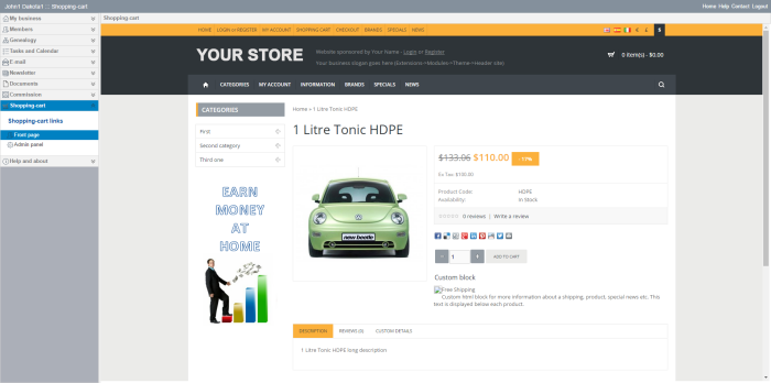 Manage Products, Categories, product options etc. Define different prices per customer group, special prices, gift vouchers, different shipping and payment modules.